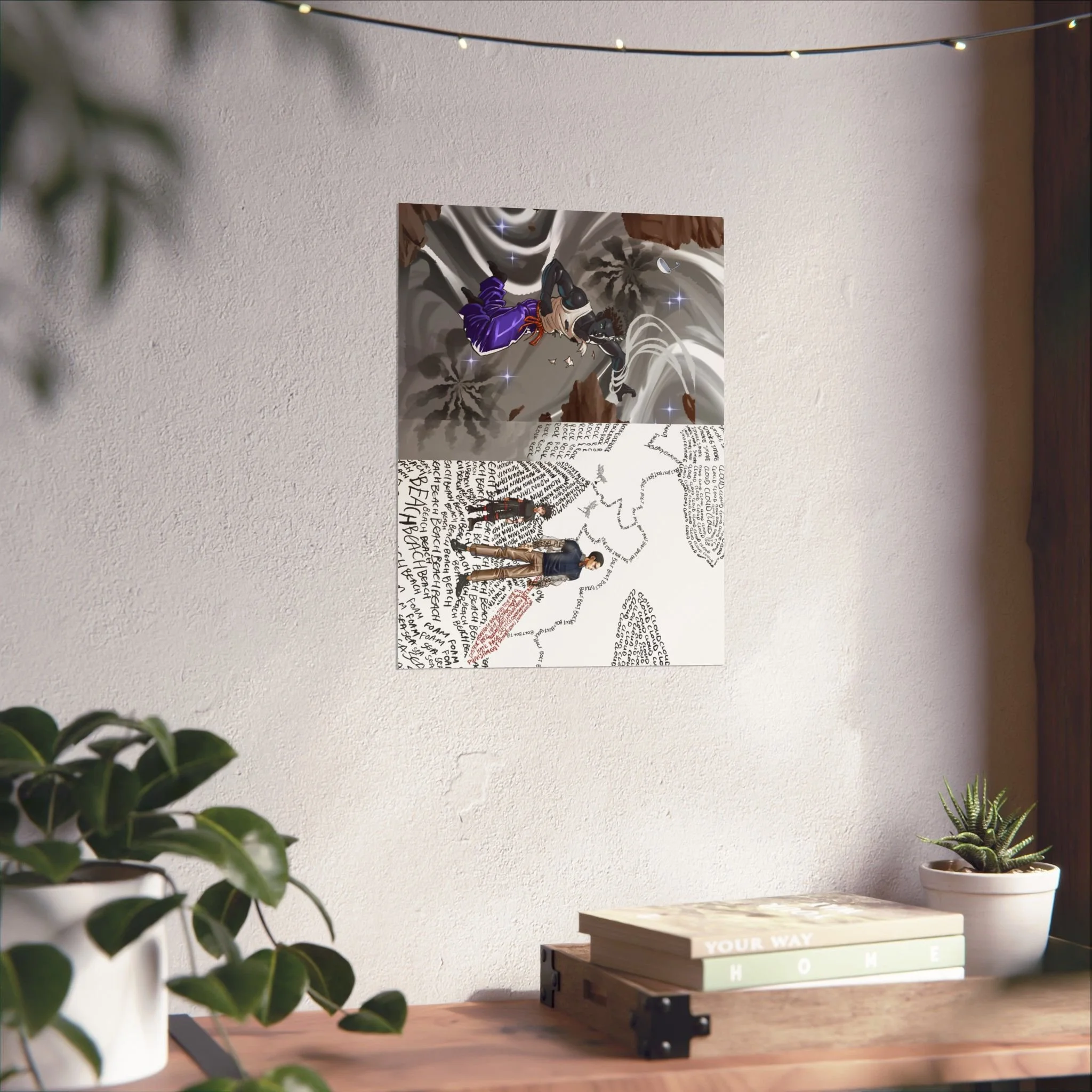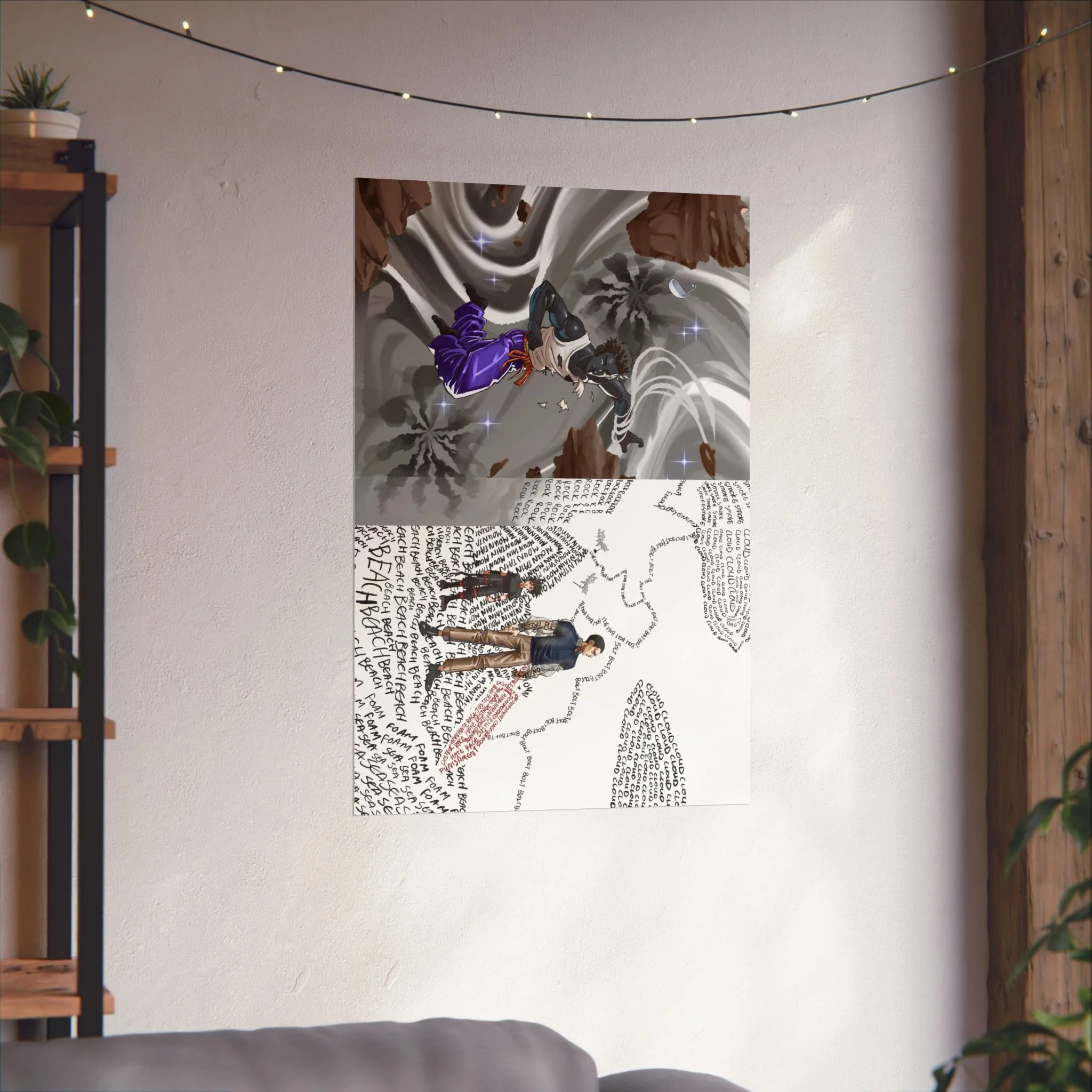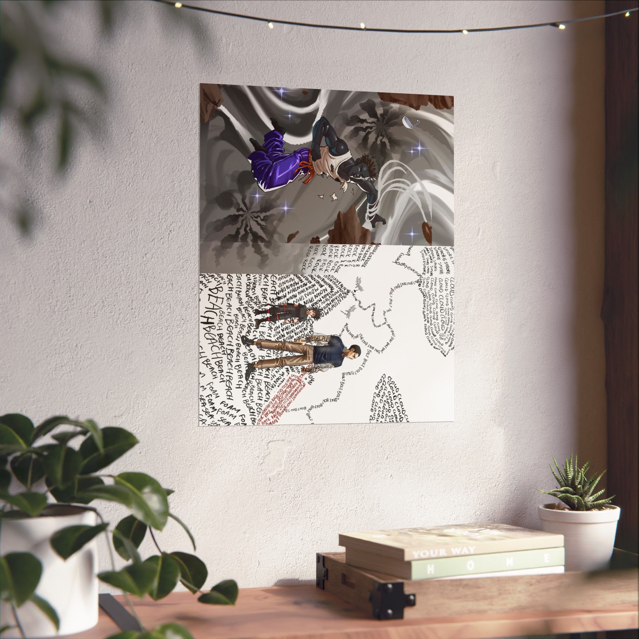 Two contrasting scenes — the tempestuous, metallic-silver vista of Elsewhere, starting place for the embodiment of eternity, Endless, and the letter-filled landscape of words, the Wordscape, where Prevention and Lexicon stand among scrawled nature —a layered story of conflict and reflection.