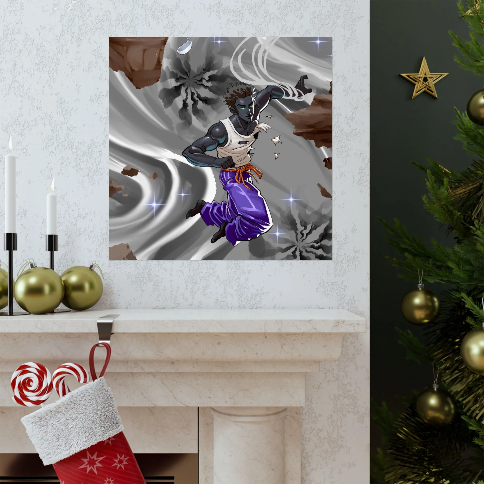 A striking matte poster that brings urban fantasy into any room. The design centers on a dynamic, athletic spaceman known as Endless soaring through the swirling, otherworldly metallic-silver realm known as Elsewhere, punctuated by rocky fragments and starlike sparkles.